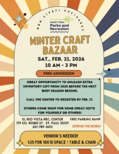 Shop handmade crafts and goods at El Rio Vista’s Winter Craft Bazaar. Vendor spots available. Call 651-789-3692. facebook.com/ElRioVistaRecreationCenter.